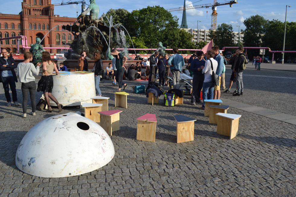 Most friendships starts by sitting together at a table. But what to do, if there is no table or kitchen, and the only common space is in the middle of the city? In the occasion of 160 years of german - uruguayan friendship, architects, artists and designers from Montevideo and Berlin come together for a one day workshop in order to develop mobile cooking constructions. Eating, drinking and talking will take place the same evening. Alexanderplatz in Berlin was invaded by our Food Dialogue ‘’runaway gang’’, marching from the Instituto Cervantes, giving visibility to a cooperation in between German and Uruguayan partners by cooking, eating and drinking with our own designed and crafted Oven Mobile (‘’BURNie’’), Drinking Mobile (‘’BARnie’’), Preparation Mobile (‘’BAKEy’’) and Seating Container Mobile (‘’DOMObile’’), a 100% moving installation. Uruguayan ‘’empanadas’’ with German fillings, ‘’Mate’’ rounds vs Pilsener Beer, discussions and heated debates attracted curious pedestrians and allowed the urban dialogue, and no matter what culture, language or origin, this action demonstrated that food still brings people together.